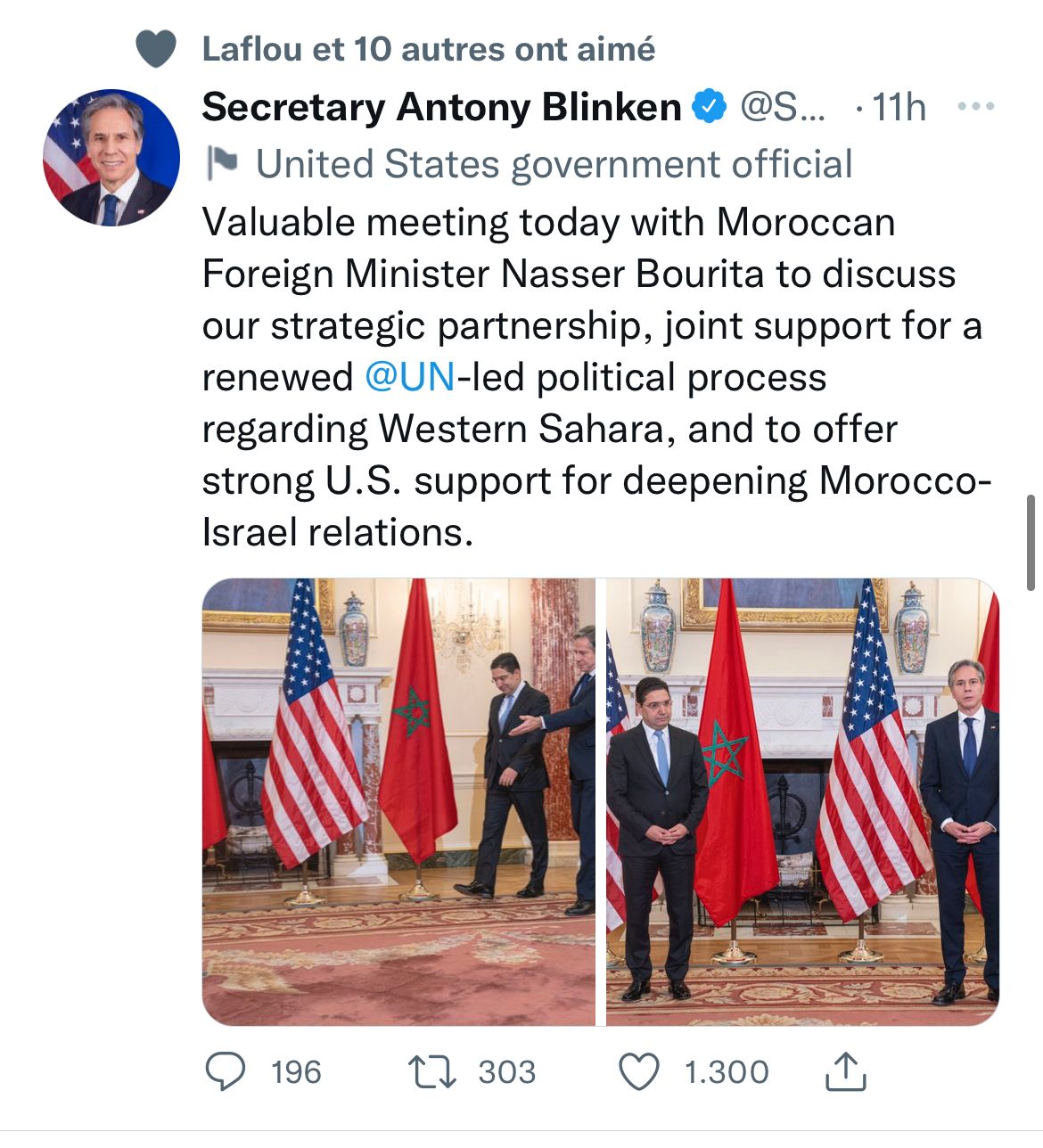 في تعليق له عبر صفحته الرسمية “تويتر” صرّح وزير الخارجية الأمريكي السيد أنتوني بلينكن مرفوق بصورتين مع وزير الخارجية المغربي ناصر بوريطة خلال مراسيم استقباله أمس: <<لقاء قيم اليوم مع وزير الخارجية المغربي ناصر بوريطة لمناقشة شراكتنا الاستراتيجية، والدعم المشترك لعملية سياسية متجددة بقيادة الأمم المتحدة فيما يتعلق بالصحراء الغربية، ولتقديم دعم أمريكي قوي لتعميق العلاقات المغربية الإسرائيلية.>>