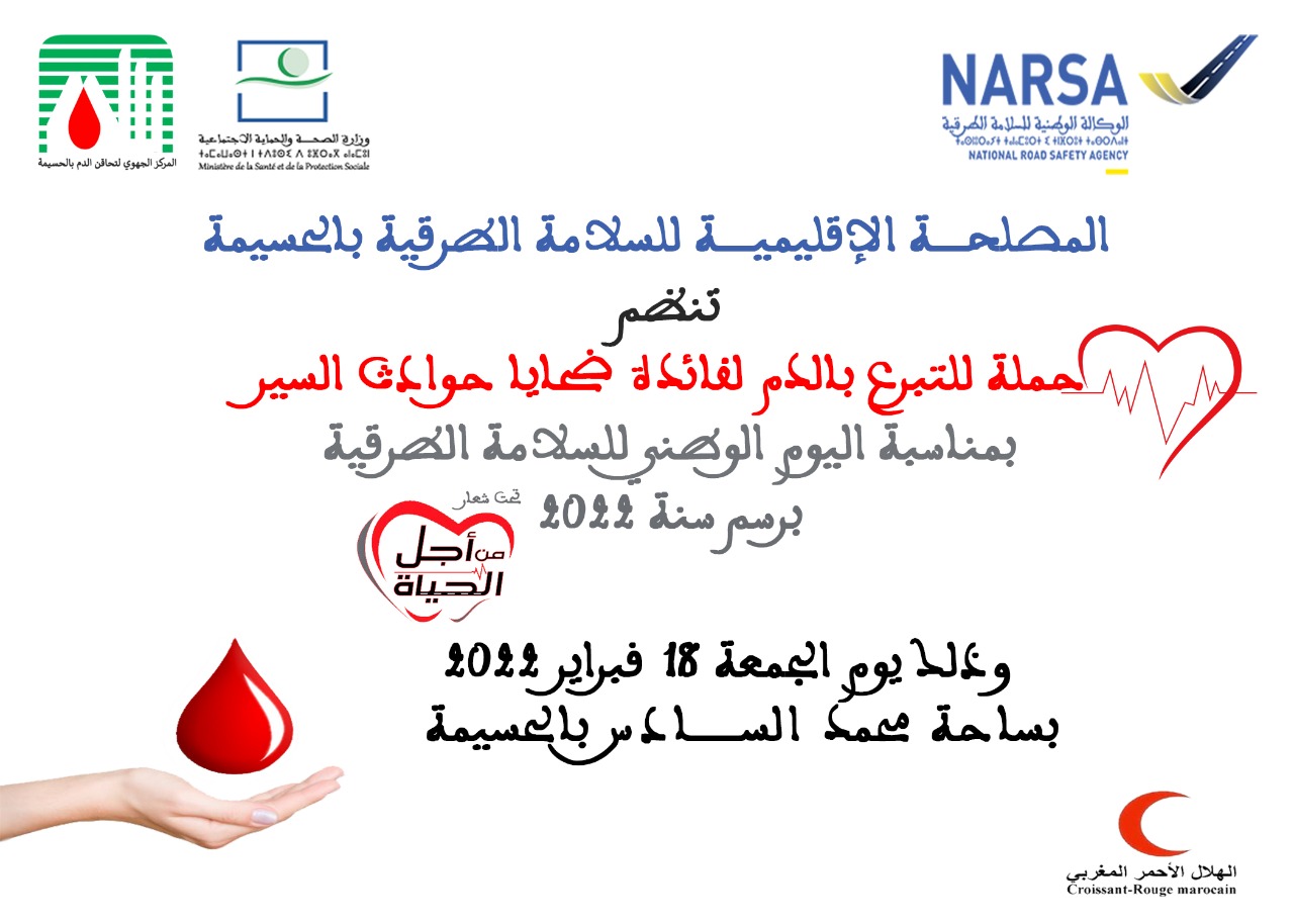 أعلنت المصلحة الإقليمية للسلامة الطرقية (نارسا) بالحسيمة، عن تنظيم حملة تبرع بالدم ستخصص لفائدة ضحايا حوادث السير بالإقليم، سيشرف عليها موظفو مركز تسجيل السيارات.