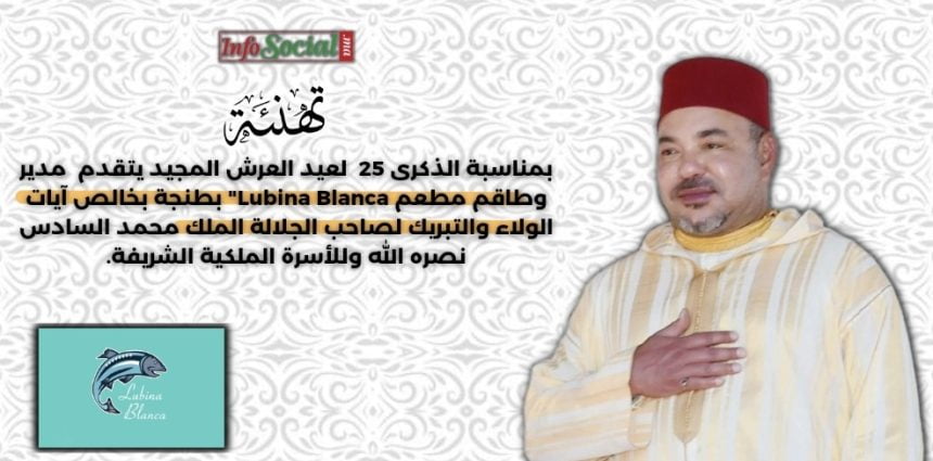 بمناسبة الذكرى الخامسة والعشرين لعيد العرش المجيد، يتقدم مدير وطاقم مطعم Lubina Blanca” بطنجة، بأسمى آيات التهاني والتبريكات لجلالة الملك محمد السادس وولي العهد الأمير مولاي الحسن وسائر العائلة الملكية الكريمة، والشعب المغربي العظيم. إن هذه المناسبة العزيزة تشكل فرصة لاستحضار ما تحقق من إنجازات عظيمة خلال ربع قرن من الحكم الرشيد، حيث شهدت المملكة المغربية تطورًا وازدهارًا في مختلف المجالات، بفضل القيادة الحكيمة والرؤية الثاقبة لجلالته.