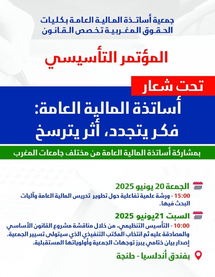 تحتضن مدينة طنجة، يومي الجمعة والسبت 20 و21 يونيو 2025، أشغال المؤتمر التأسيسي للجمعية المغربية للمالية العامة، وذلك بفندق أندلسيا، بمشاركة نخبة من الأساتذة الجامعيين والباحثين المختصين في قضايا المالية العامة من مختلف الجامعات المغربية.