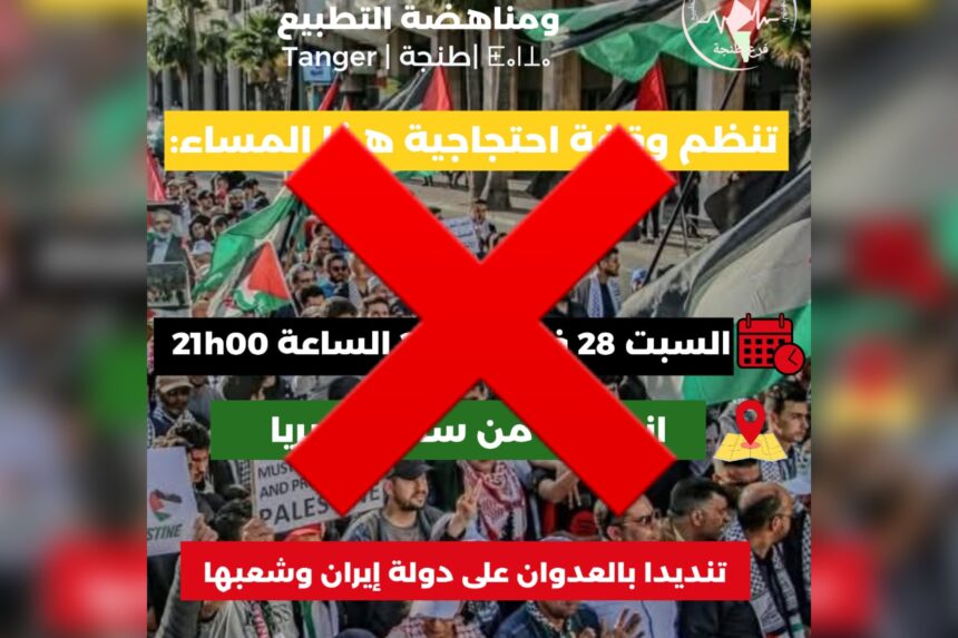 أصدرت السلطات المحلية بمدينة طنجة قراراً يقضي بعدم الترخيص لوقفة احتجاجية كانت مقررة مساء اليوم السبت بساحة ساحة إيبيريا، وذلك استجابة لدعوة أطلقتها الجبهة المغربية لدعم فلسطين ومناهضة التطبيع للتعبير عن التضامن مع إيران. القرار الإداري نص على المنع الشامل لأي تجمع أو مسيرة في التوقيت والمكان المحددين.